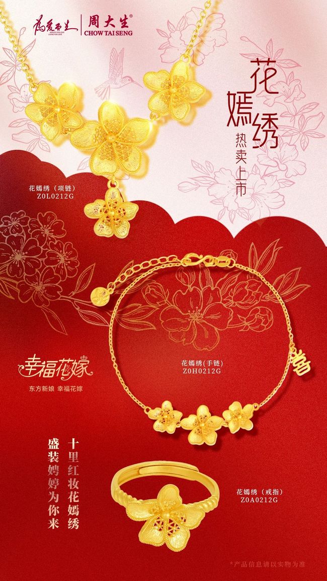 东方新娘,幸福花嫁。周大生珠宝幸福花嫁系列作为送给东方新娘的婚嫁囍饰,将传统婚嫁元素和文化寓意融入到新品设计中,传递刻有品牌印记的专属祝福。愿中式婚嫁囍饰与东方美学的结合能为新人们送上更多仪式感,在高朋满座中将深藏的爱意说到尽兴。
