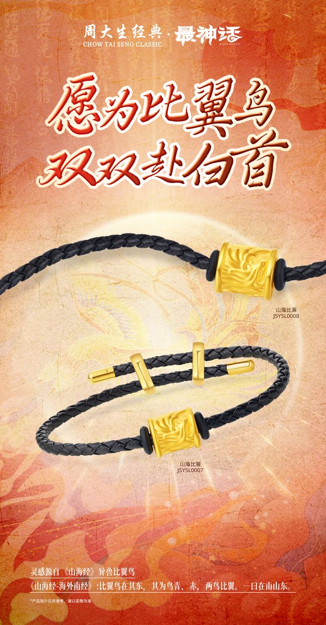 比翼鸟自古以来便被当作夫妻同心的象征,恋人间往往有“在天愿做比翼鸟”的真爱誓言。周大生经典最神话系列“山海比翼”设计灵感源自《山海经》的异兽比翼鸟,高度还原比翼鸟展翅高飞的神态,象征着爱人相携遨游山海的美好期待,更诉说非卿不可的浪漫心意。