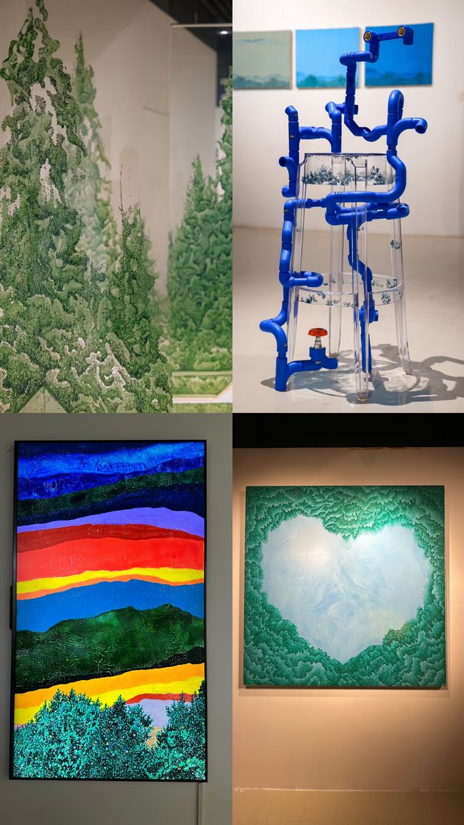 展厅入口处,九幅巨幅油画装置以15°倾角悬浮于半空,构成《虚数森林》。观众穿行时,碎片化的松针、苔痕与电子色光在视角切换中重组为连续影像,混凝土展厅被拓扑成流动的山谷。这种“动态平面”的造景术,恰是艺术家“一吨风景”系列的核心理念——以点的量子化笔触解构传统风景范式,在镜面对称的虚实褶皱间,称量自然、文明与数字幽灵的质量守恒。